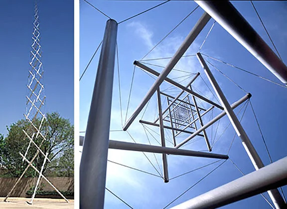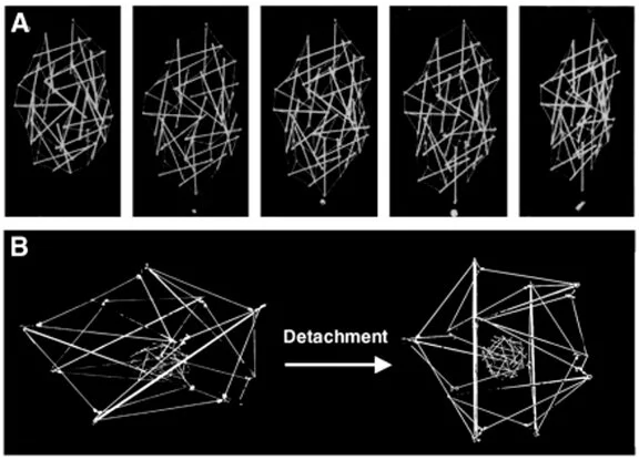 As is so often the case with “outside the box” ideas, Dr. Ingber got his first inspiration not from a biology textbook, but rather, from the world of sculpture and architectural design, which have been his passions since he was a youth. It is while studying the work of a contemporary sculptor, Kenneth Snelson, as an undergraduate at Yale in the 1970s, that Dr. Ingber was first introduced to the concept of tensegrity (or tensional integrity). Tensegrity refers to structures whose integrity and stability are governed not by continuous compression or gravity (as in the case of our typical rectangular buildings or a stone arch), but rather, by a sustained balance between tension and compression. A tensegrity structure is mechanically stable not because of the strength of individual members, but because of how the entire structure distributes and balances mechanical stresses.